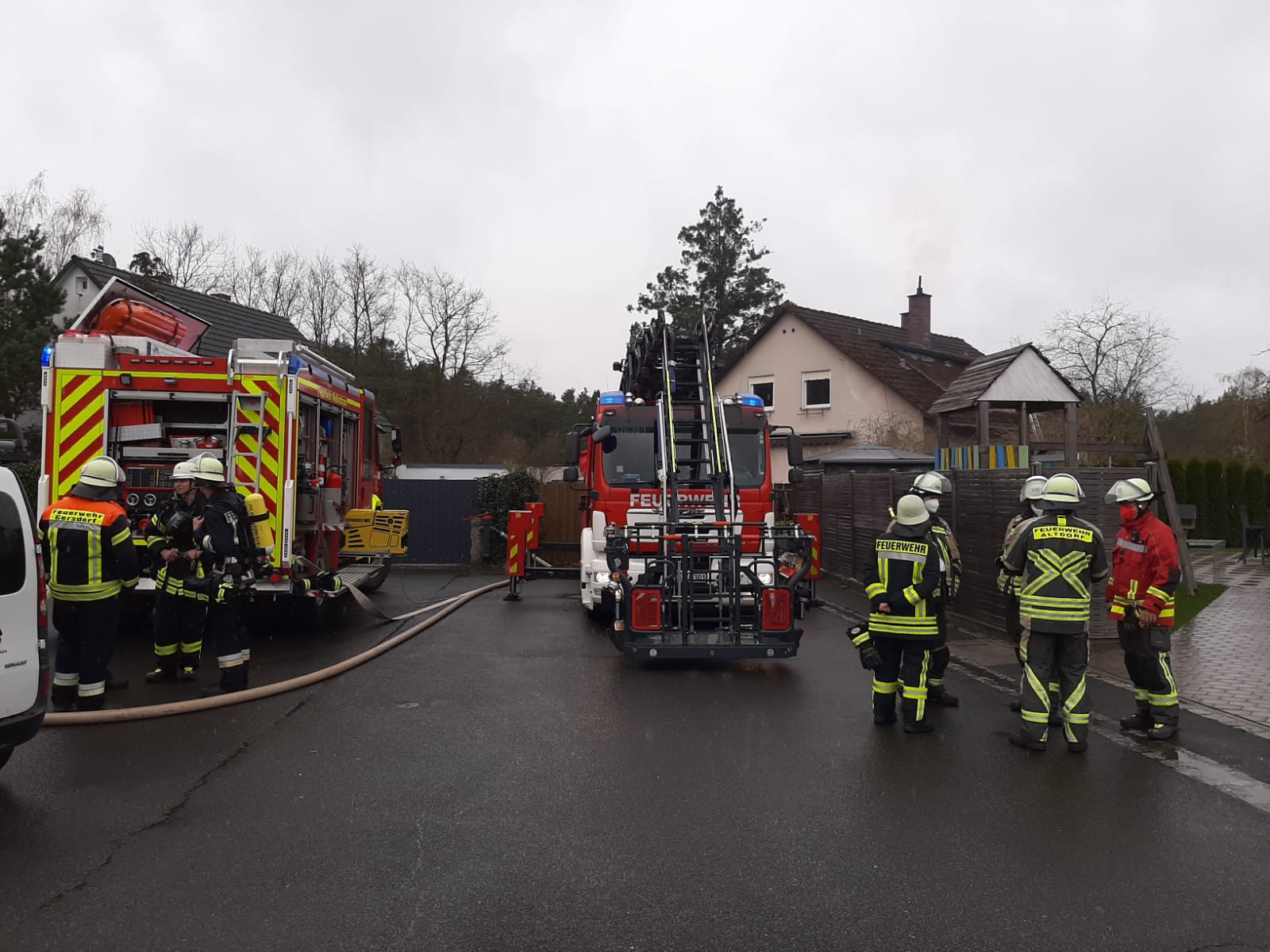 Bei unserem Eintreffen hatte die FFW Weißenbrunn bereits den Löschangriff aufgebaut und war mit einem Trupp Atemschutzgeräteträger im Einsatz. Wir stellten mit einem Kameraden aus Weißenbrunn einen Sicherungstrupp für den Atemschutz. Bei diesem Einsatz kam auch die Drehleiter aus Altdorf zum Einsatz. Dort wurde der Kamin mit der Wärmebildkamera überprüft. Nachdem der Kaminkehrer vor Ort war und den Kamin gereinigt hatte, konnten wir nach ca. 1,5 Stunden wieder einrücken.