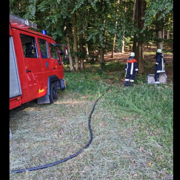 Am Einsatzort angekommen erkundeten die drei Gruppenführer die Lage und entschieden, dass wir von unserem Auto mit dem Schnellangriff starten. Diesen verlängerten wir mit zwei Schlauchkörben, bis wir im Wald am brennenden Baumstumpf ankamen.